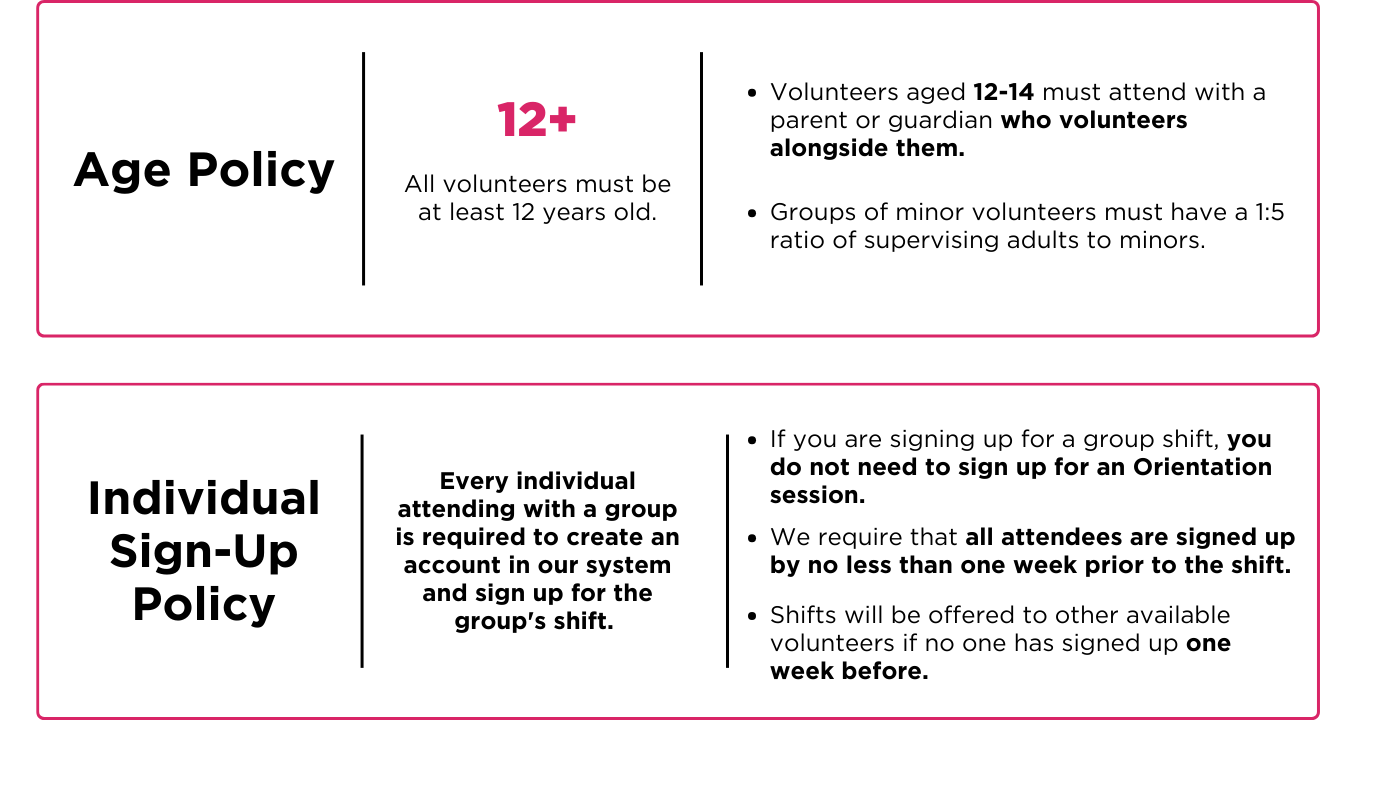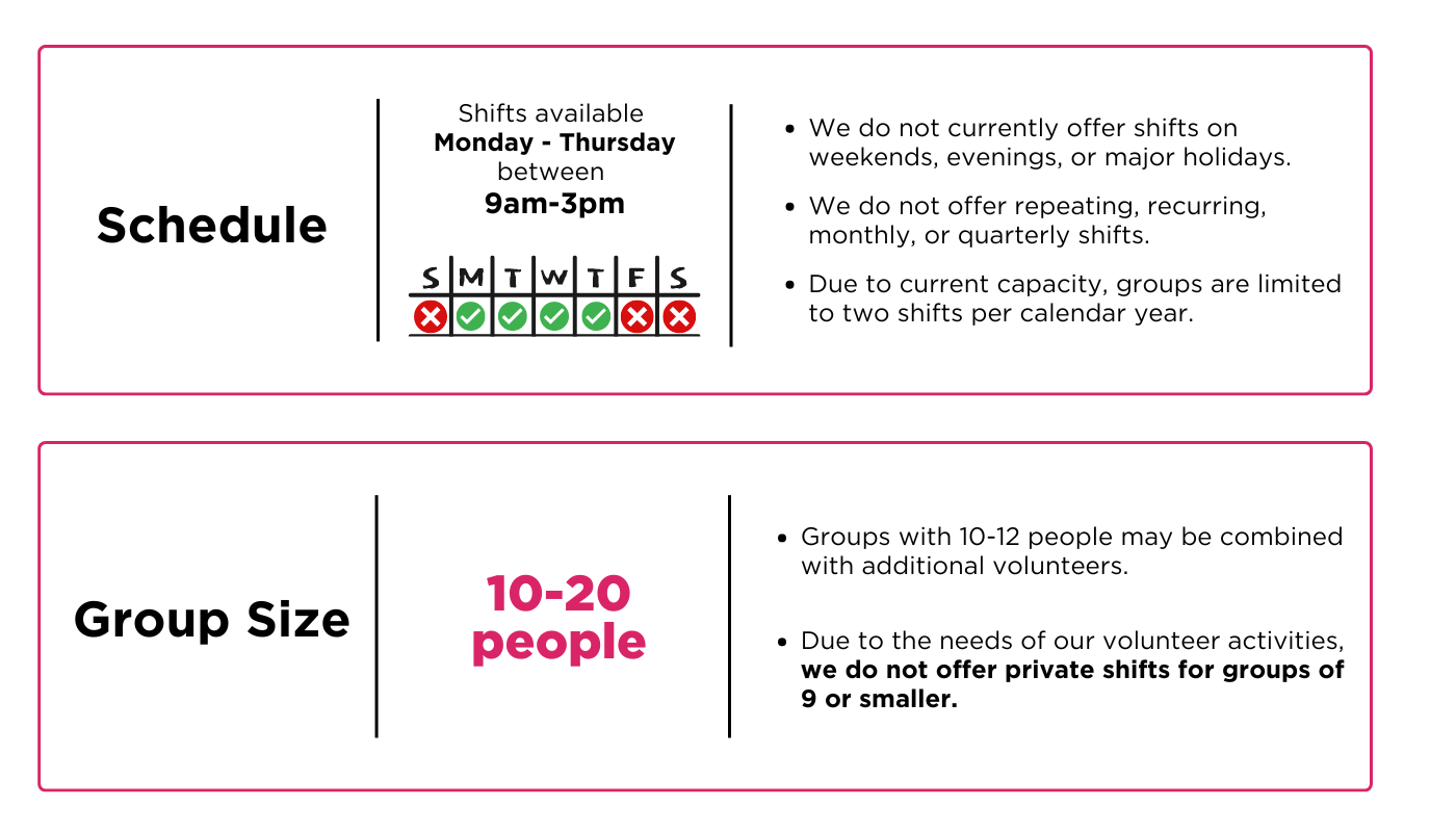 If your group meets these requirements, we would be thrilled to help plan a time for you to come in and volunteer. As a reminder, we are booked until January and do not offer shifts on Fridays. Please complete this form to submit your request.