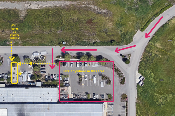 Please park in the lot on your left as you enter our complex, next to the Feeding the Foothills sign. Once parked, please walk along the crosswalk, across our loading dock, and wait for your shift leader at the green picnic tables or in the lobby.